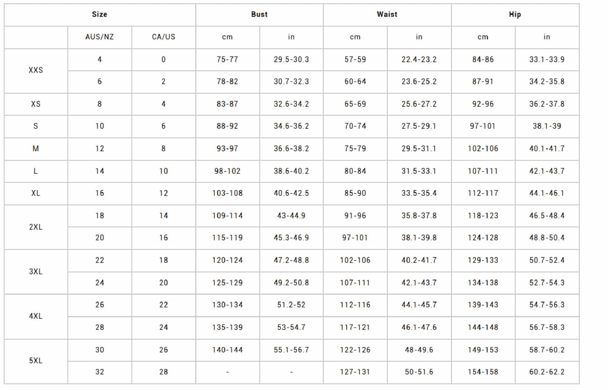 XS – 2XL